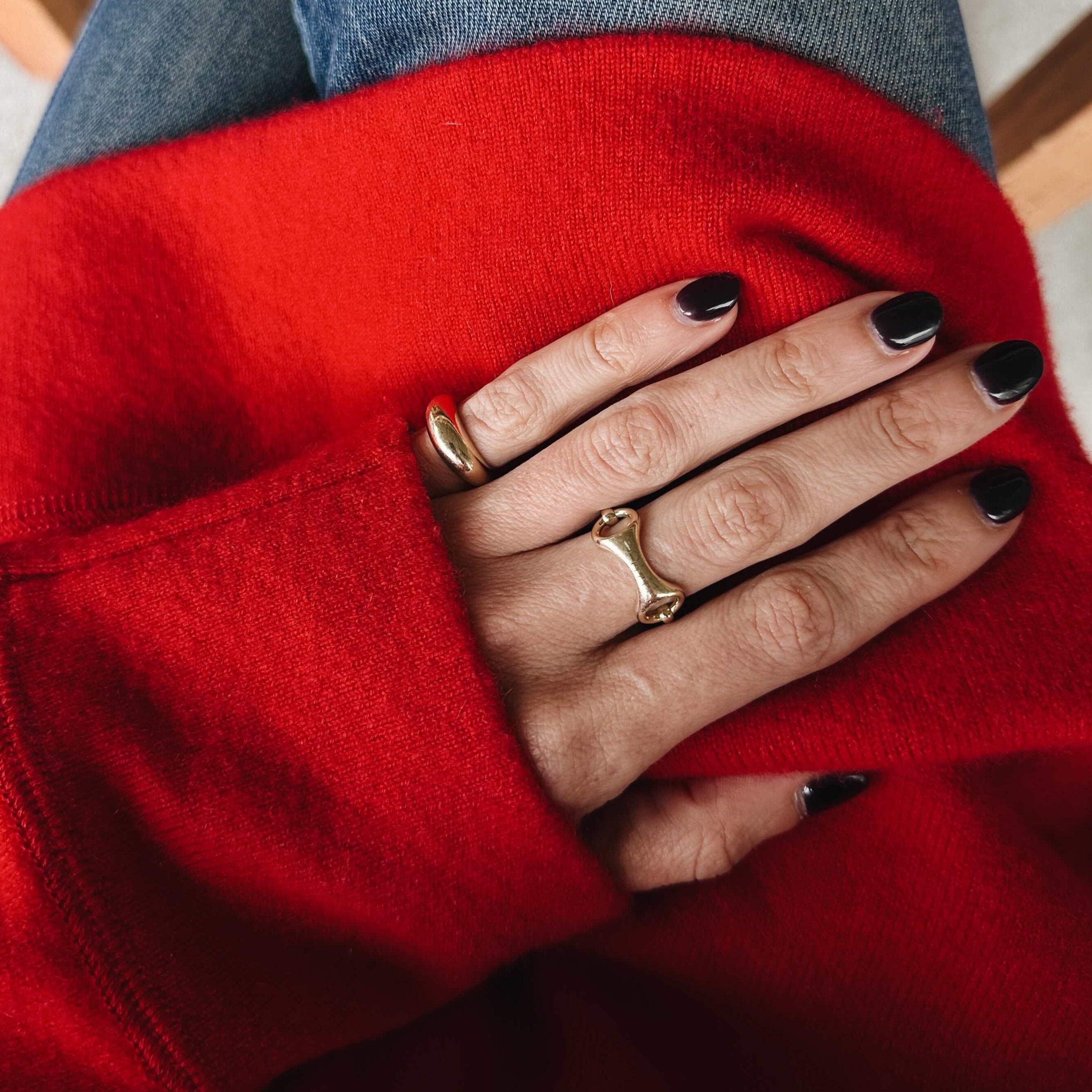 A captivating yellow gold Bubble Ring featuring organic shapes with a subtle touch of structure, designed to be worn as a striking single smooth hollow piece or paired as a set for a bold, cohesive look - Gabriela ArtigasFashioned in yellow gold, the Bubble Ring highlights organic shapes with structured flair, intended as a hollow, smooth piece to wear individually or as a coordinated set - Gabriela Artigas