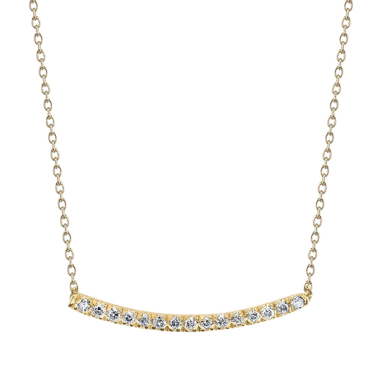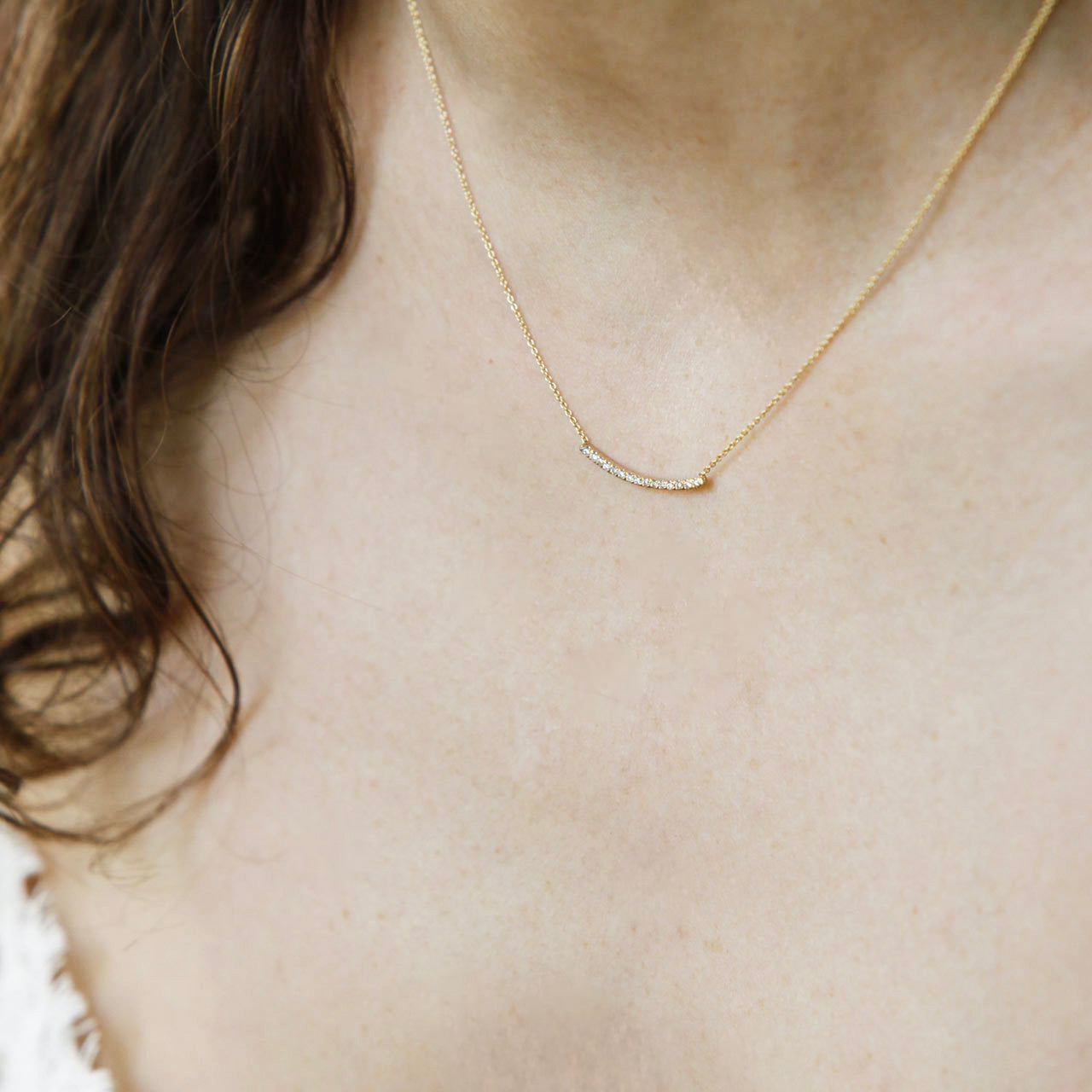 アクシスネックレスは、エレガントにカーブしたダイヤモンドの列で、首に輝きのヒントを加えます。