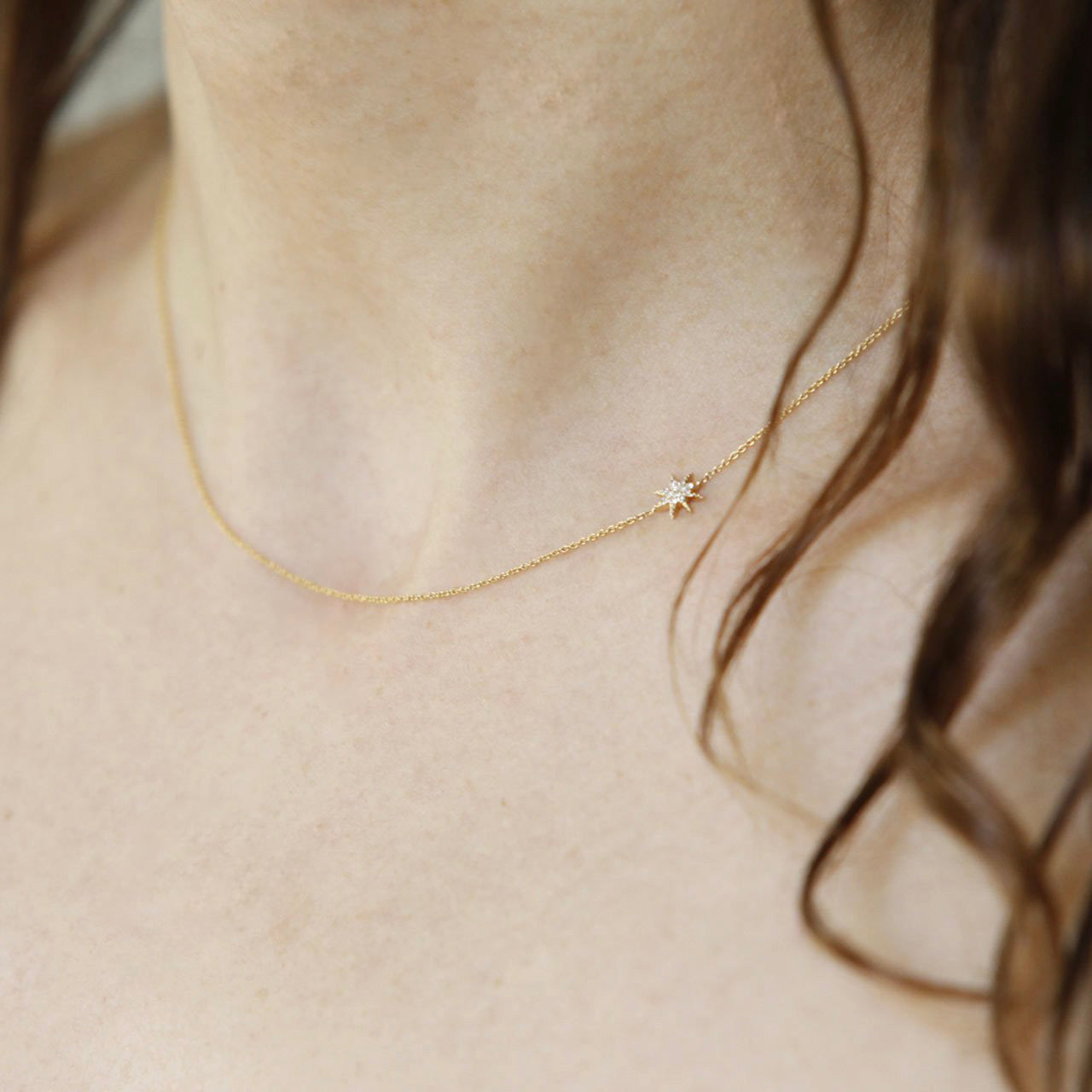 首の脇にぴったりとフィットするパヴェダイヤモンドをあしらった繊細なシングルスターセット。