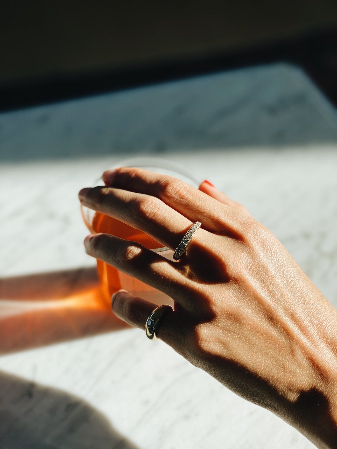 あらゆる機会を照らすパヴェダイヤモンドで飾られた私たちの署名ライジングタスクのデザイン。