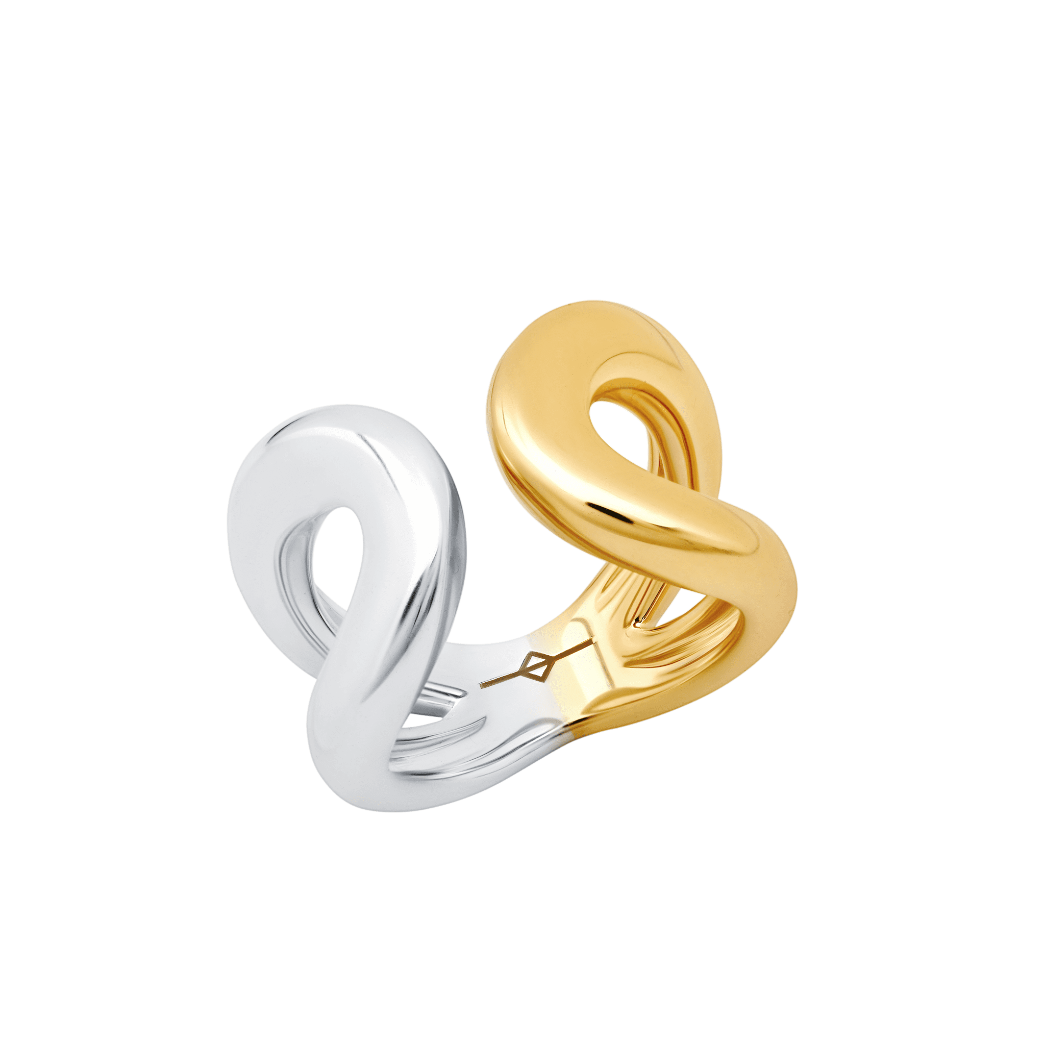 柔らかな曲線とネガティブスペースが対称的にバランスをとったこのリングは、構造的で大胆な作品となっており、曲線のエッジが作品に柔らかさを加えています。