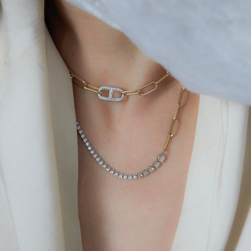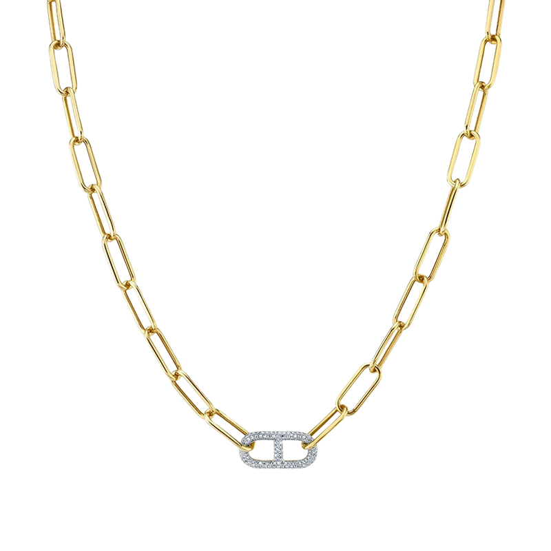 The necklace features classic 14K gold rectangular links connected by two stirrups in 14K white gold. These stirrups are adorned with sparkling pavé diamonds, adding a touch of luxury and brilliance to the design