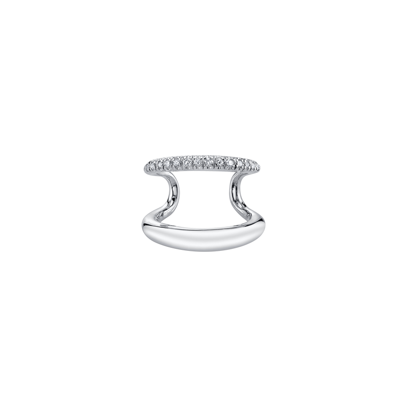 This ear cuff is part of The Twin Tusk Collection which explores the themes of duality and infinite oneness. This ear cuff sees the convergence of polished, 14-karat gold with sleek white diamonds.